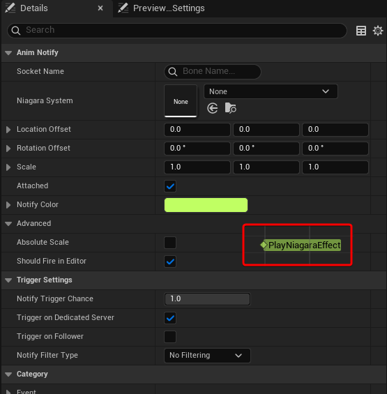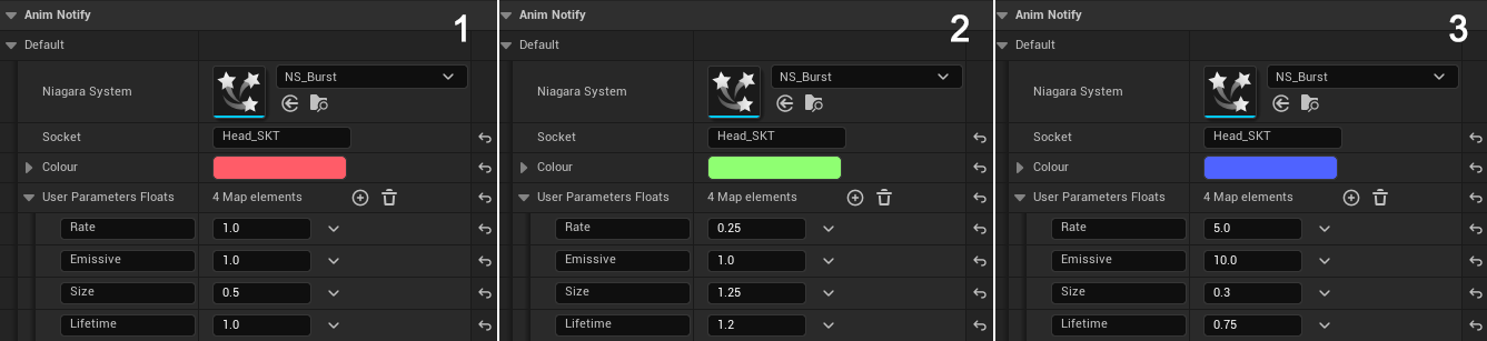 Here I’m using the same notify to set the parameters Spawn, Lifetime, Size and Emissive exposed by the Niagara System.