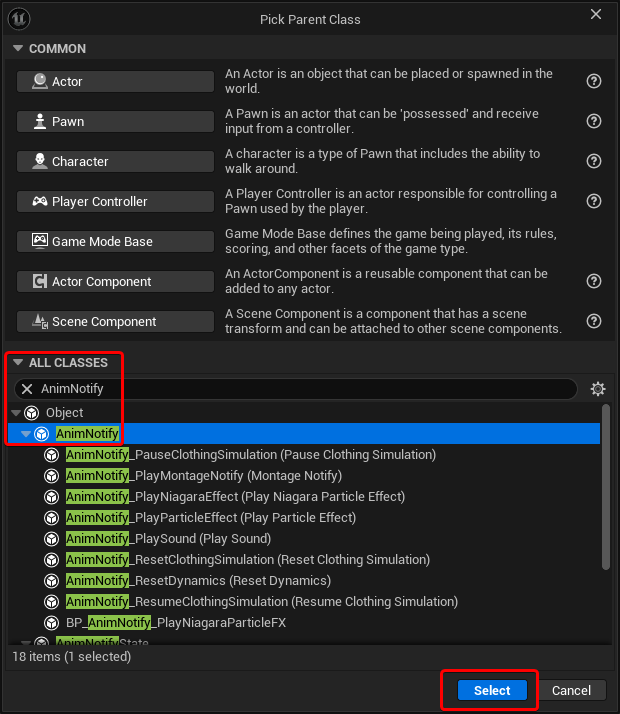 First things first, we need to make a new Blueprint, using the AnimNotify class as the parent. I’ll call it BP_AnimNotify_PlayNiagaraParticleFX, so that it shows up when searching for the engine provided Play Niagara Particle Effect, but it’s also clear that it’s something custom.