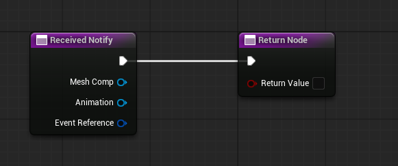 This adds a function to the list, which contains 2 nodes, a “Received Notify” and a “Return Node”. The first node also passes through a reference to the Mesh Component that triggered the Anim Notify, a reference to the Animation itself, and also an Event Reference Struct. This last one I’m honestly I’m not really sure what kind of data it holds, since I was not able to split (please do reach out if you know). The second takes in the Execute pin as well as a Boolean “Return Value”, which I assume is the classic “success” Boolean some function passes through. However, usually Anim Notifiers are mostly used in a “fire and forget” fashion, and in the context of Blueprints, I haven’t found much use of it, but it might be different in C++.