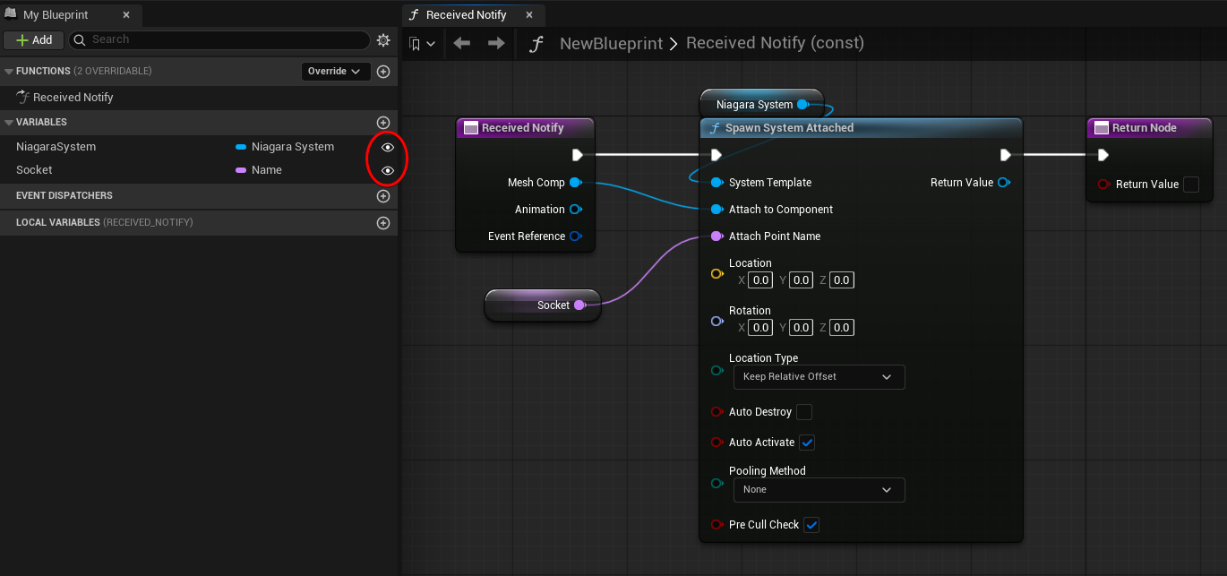 Let’s add a Spawn System Attached node, use the incoming Mesh Component as the attachment, and expose both the Niagara System and the Socket name as editable variables.