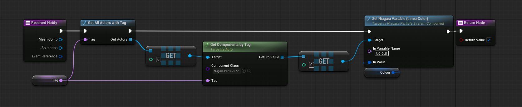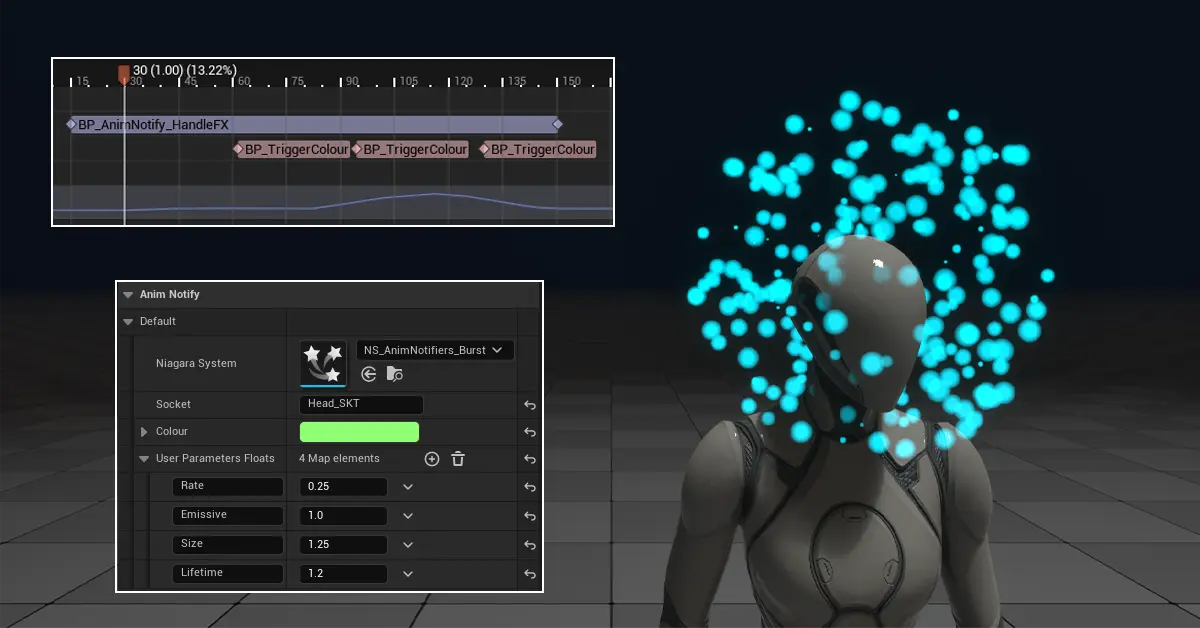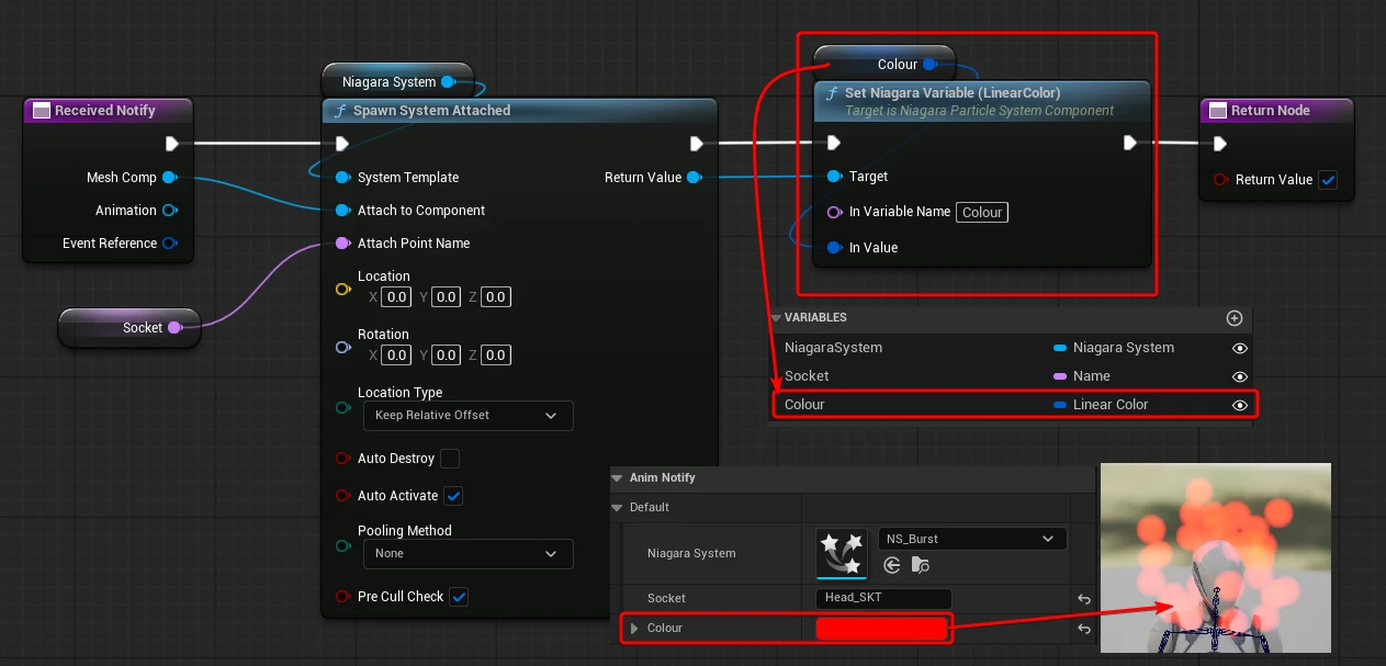 In my test example, I’ve used an Anim Notify State to “handle” the FX, spawning it at the start and deactivating it at the end. While another Anim Notify sets the colour of the particles to a new colour every time it triggers.