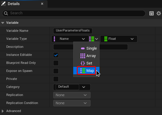 For this example, I’ve only set up a Variable Map for Floats, but you can expand it to have other Variable types, of course. However, keep in mind that if your aim is to create a generic Anim Notify that can be used in multiple instances, starting to add all kind of parameters types it might be a little bit excessive. In that case, you might want to reconsider if they should all be included in this “Generic Anim Notifier”, or if you are better off making a more custom “Case by Case” notify.