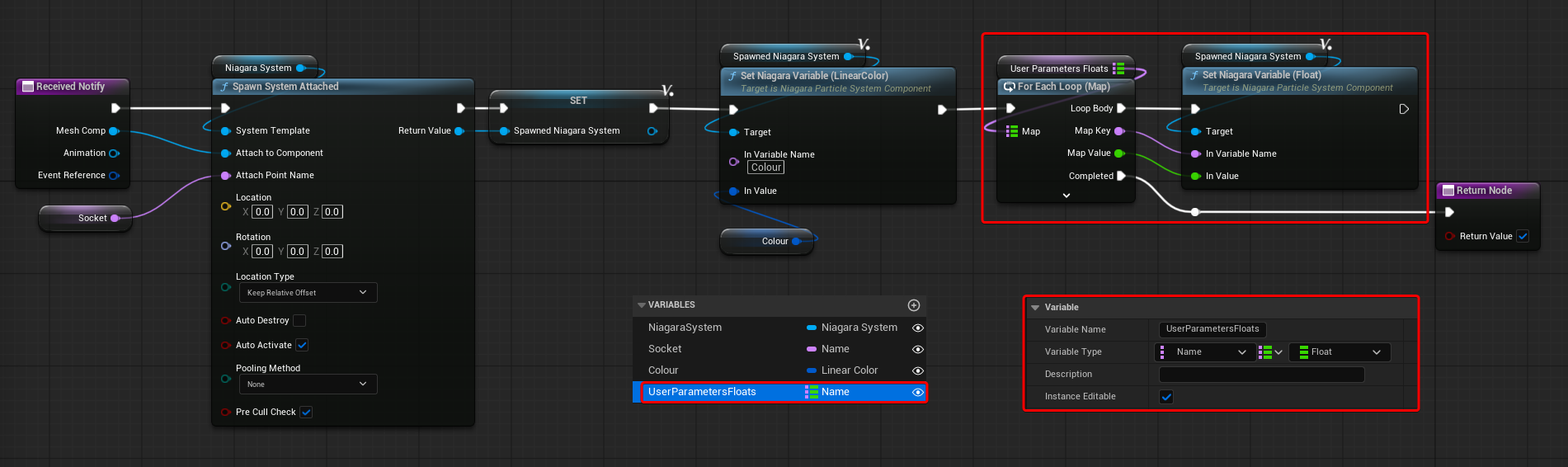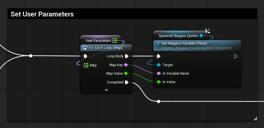 After the Niagara System Component gets spawned, both methods converge to the User Parameters Variable Map Loop. I’ve only exposed a float attribute array for now.
