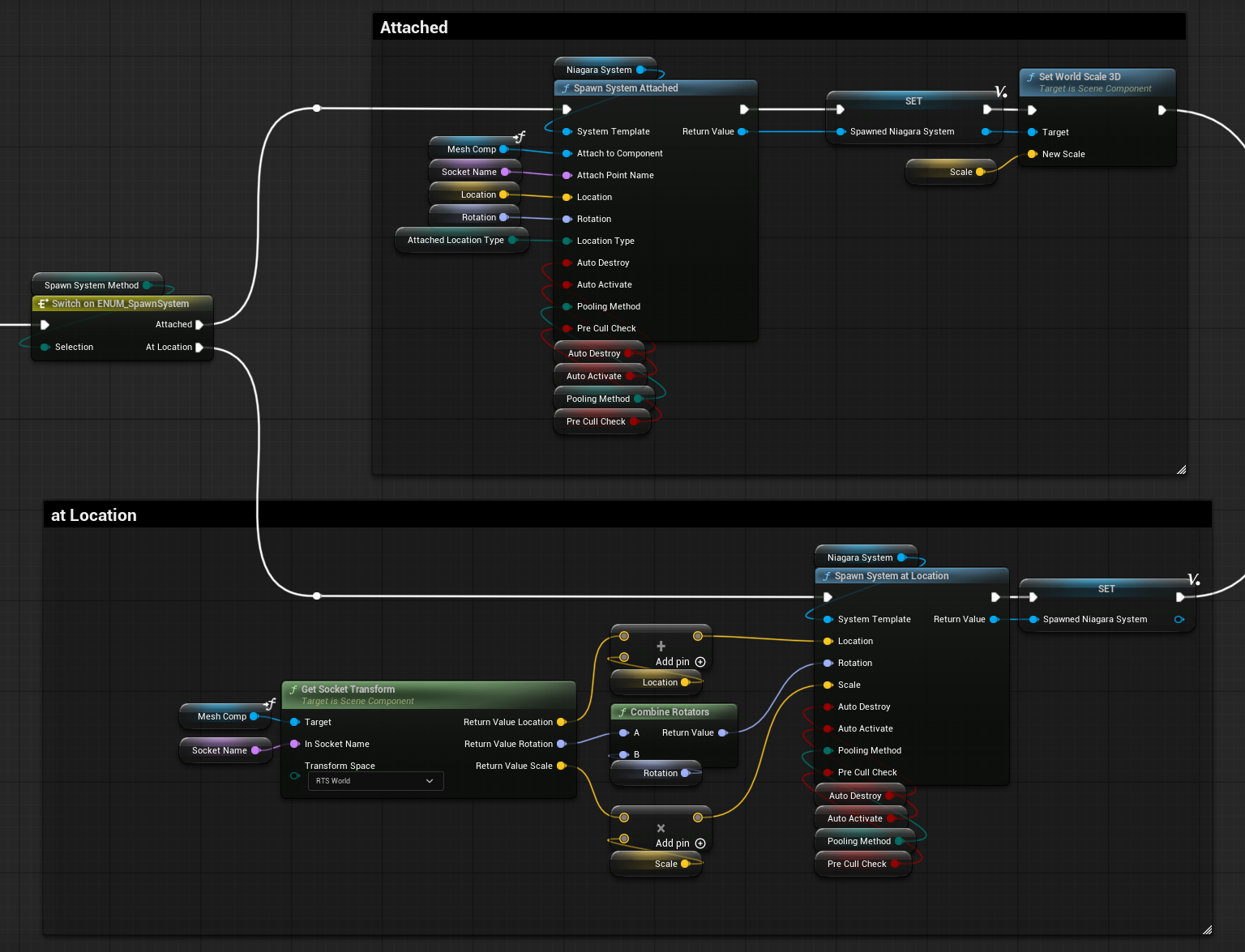 I’ve then made an ENUM that allows for switching the logic from “Spawn System Attached” to “Spawn System at Location”. The first one is the same as it was shown before, while the second one it’s using a target socket to define the transforms of the Niagara Component that gets spawned.