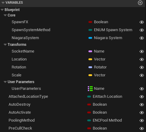 Now the fun part, we are spawning our own Niagara System, this means we can now easily expand the setup and set User Parameters on the Niagara System by exposing the values as editable variables!