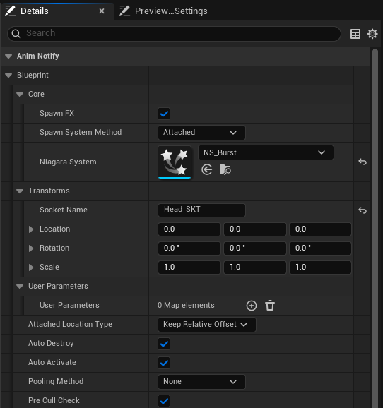 Being able to expose the User Parameters you need this way is very useful. However, these are hard-coded, restricting the use of both the Anim Notify and the User Parameters names used by the Niagara System you are creating.