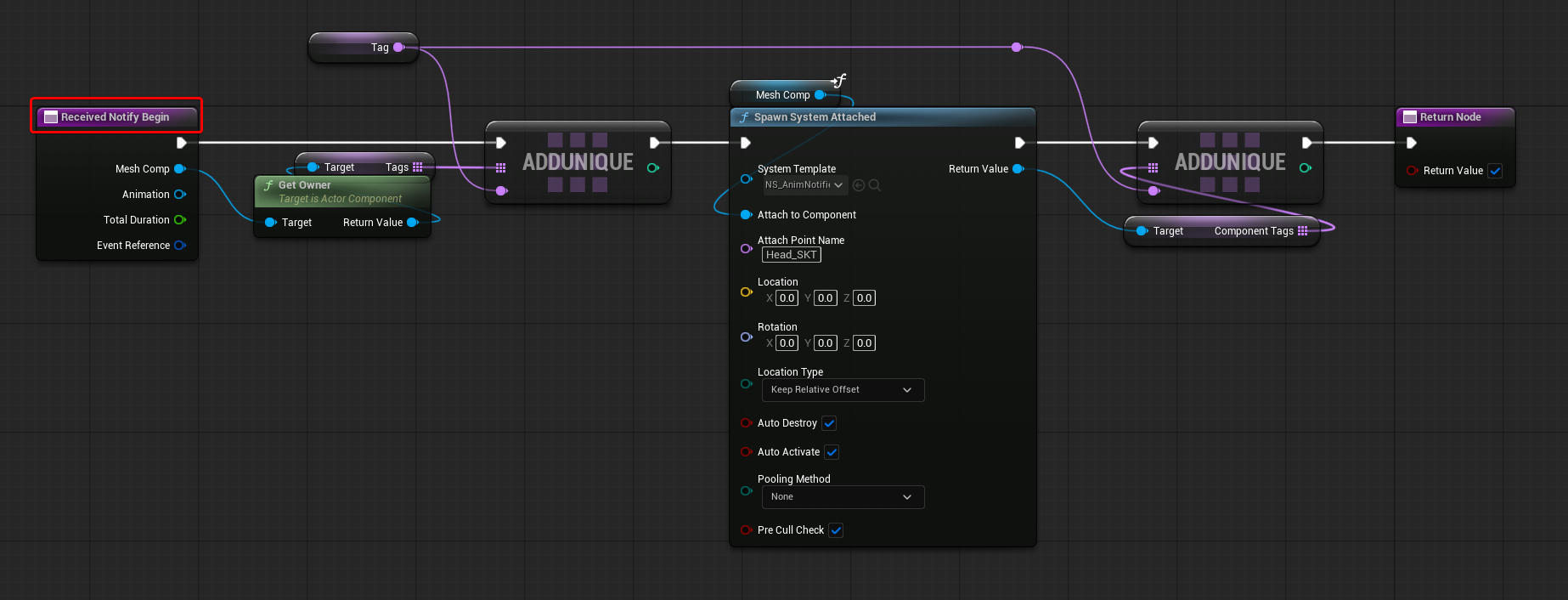 The Received Notify Begin Function spawns the Niagara System Component and adds a unique Tag Name, using an editable variable. This is added to both the Owner of the Mesh Component (the Actor that holds it) and the newly spawned Niagara System Component.