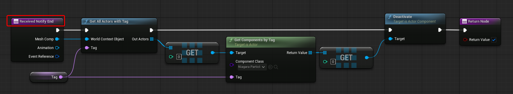 While the “Received Notify End” function deactivates the Niagara System Component, it only does so after fetching its reference by using the specified tag.