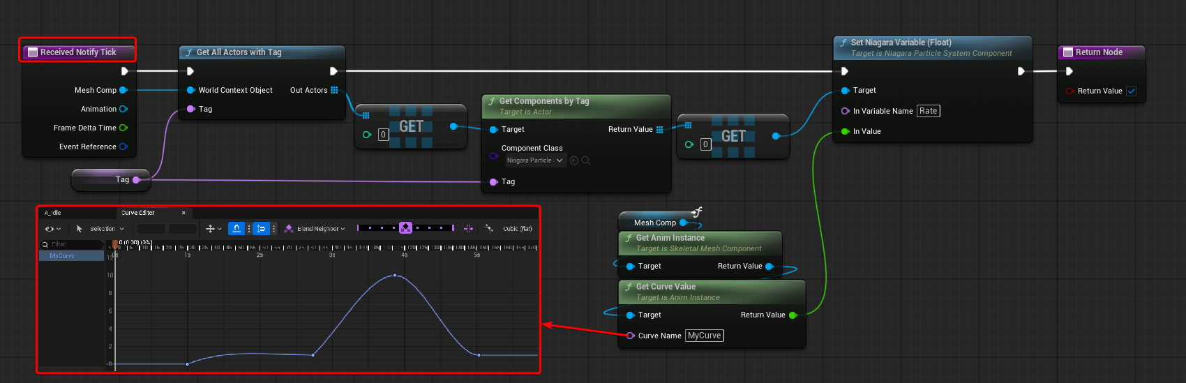 I’ve also then overridden the “Received Notify Tick” function to do the sampling of the Animation Curve and updating the Spawn Rate of the Niagara System.
